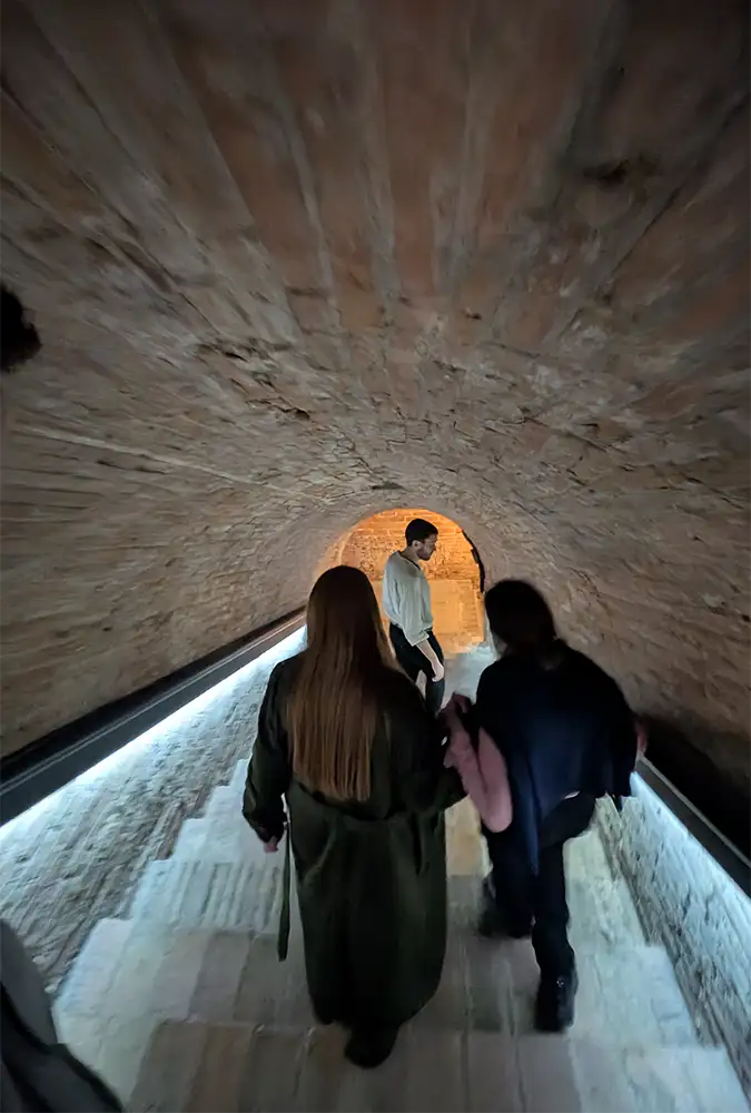 Depois da parte inicial, a visita desce mais de vinte metros abaixo do solo. O ambiente muda imediatamente e a temperatura cai. O percurso segue em um pequeno trem elétrico que chacoalha e faz barulho enquanto avança pelas galerias escavadas sob o complexo.